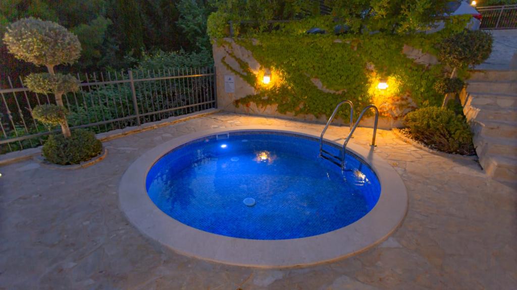 Die Villa erstreckt sich über zwei Etagen mit einer Gesamtfläche von 180 Quadratmetern. Das Erdgeschoss dieser Schönheit besteht aus einer voll ausgestatteten Küche mit Esszimmer und einem gemütlichen Wohnzimmer. In der Küche finden Sie alles, was Sie zum Zubereiten und Servieren von Speisen benötigen, und das Esszimmer ist für 8 Personen ausgestattet. Tagsüber lädt das Wohnzimmer zum Entspannen mit dem Fernseher ein und nachts können Sie sich dort ausruhen das Sofa, das als Zustellbett dienen kann. Vom Wohnzimmer aus führt eine Treppe in die obere Etage, wo sich 3 Schlafzimmer und ein Gemeinschaftsbad befinden. Alle drei Schlafzimmer haben Zugang zu einem Balkon mit wunderschönem Panoramablick auf den Garten oder die Umgebung. Zwei Schlafzimmer verfügen über Doppelbetten, während die restlichen beiden über zwei Einzelbetten verfügen. Das Haus ist von einem sorgfältig angelegten mediterranen Garten umgeben. Auf der Südseite gibt es einen beheizten Swimmingpool mit Liegestühlen zum Sonnenbaden. Für Momente völliger Entspannung finden Sie im hinteren Teil des Hauses einen Whirlpool und neben dem Balkon einen Grill.