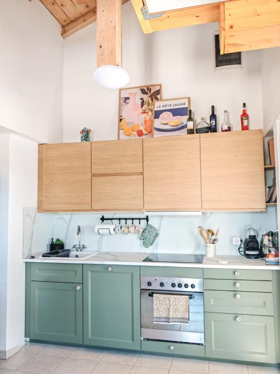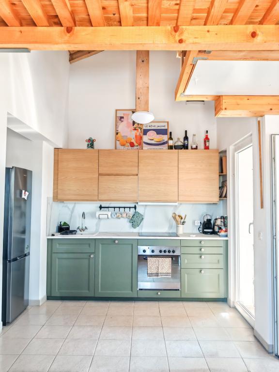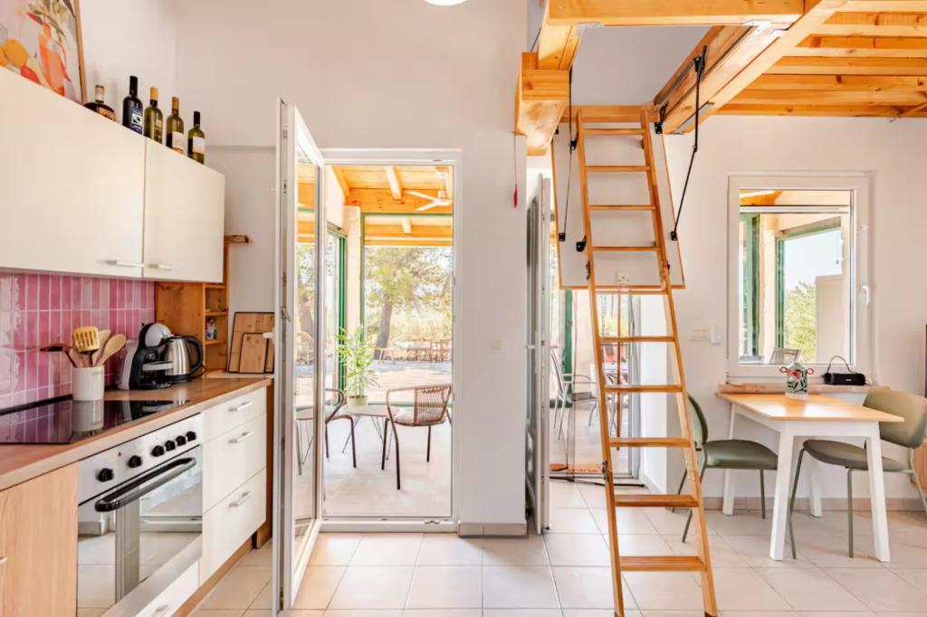 Unser Ferienhaus verfügt über drei komfortable Schlafzimmer, eine voll ausgestattete Küche und ein gemütliches Interieur zum Entspannen. Zwei Schlafzimmer befinden sich im Erdgeschoss, das dritte im Dachgeschoss, das über eine Klapptreppe erreichbar ist. Dieses Zimmer bietet einen besonders behaglichen Rückzugsort und eignet sich für ältere Kinder oder Erwachsene. Aufgrund des steileren Zugangs ist es für Kleinkinder und ältere Menschen nicht empfehlenswert. Ein Schlafzimmer im Erdgeschoss verfügt über ein eigenes Badezimmer und einen separaten Eingang, was zusätzliche Privatsphäre bietet. **Außenbereich:** Ihnen steht ein privater Außenpool mit Heiz- und Kühlfunktion zur Verfügung, ideal für die Zeit vom späten Frühling bis zum frühen Herbst. Der Pool wärmt Sie an kühleren Frühlings- und Herbsttagen angenehm auf