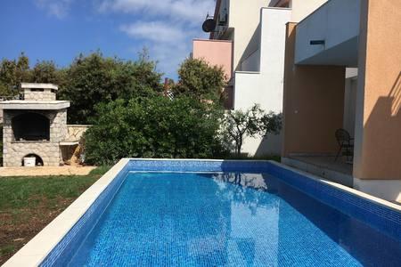 Schönes Haus mit Pool auf der Insel Pag (Ort Mandre), 200 Meter vom Meer entfernt. Es liegt in einer ruhigen Gegend, umgeben von anderen Familienhäusern. Das Anwesen verfügt über ein Schwimmbad von 8x4 m, schön angelegten Innenhof, Terrasse, Liegewiese, Grill und Parkplatz. Im Erdgeschoss des Gebäudes befindet sich ein geräumiges Wohnzimmer mit Küche, Bad, Garage und Speisekammer. Im Erdgeschoss gibt es vier Zimmer, von denen drei mit Doppelbetten und eines mit zwei kleineren Betten. Im Erdgeschoss gibt es auch ein separates Badezimmer und eine große Terrasse. Die Einrichtung bietet Platz für bis zu 8 Erwachsene im Obergeschoss und zwei weitere im Erdgeschoss (Polstercouch). Das Haus ist ideal für einen ruhigen Familienurlaub und ist komplett und modern für einen angenehmen Aufenthalt ausgestattet.