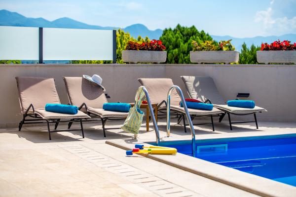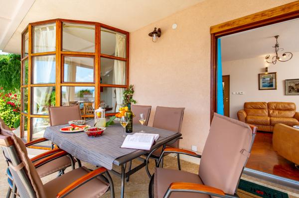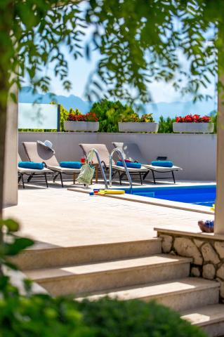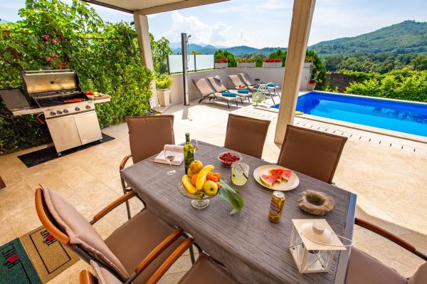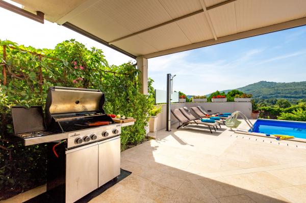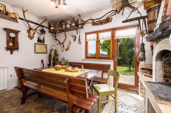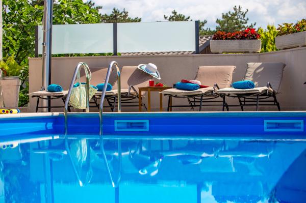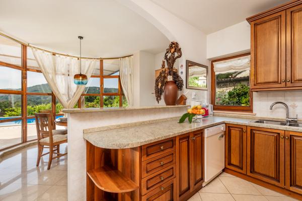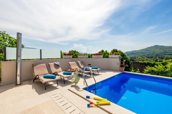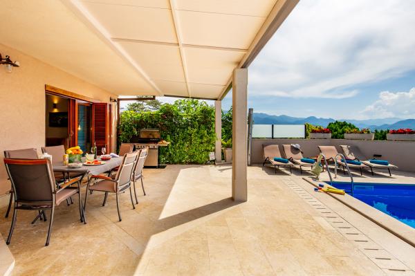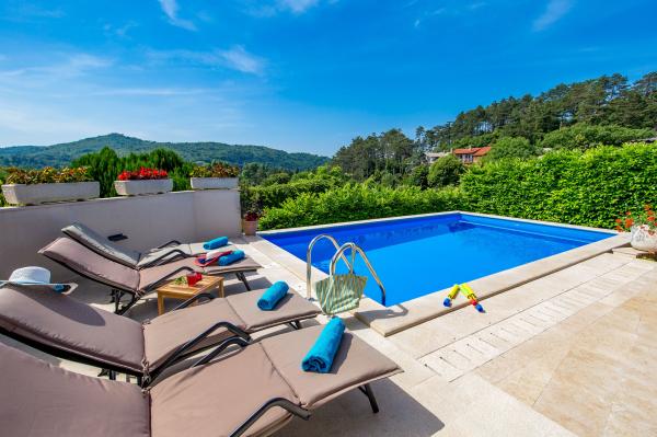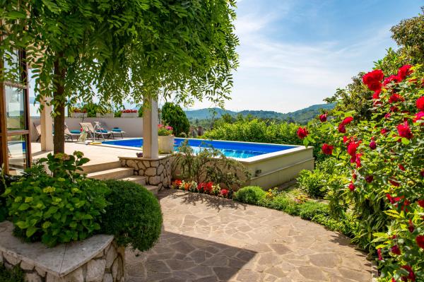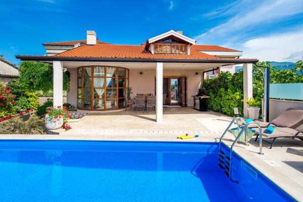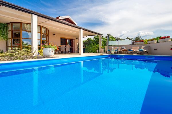 Die Villa Marijana ist ein schönes Ferienhaus im Erdgeschoss im Hinterland von Rijeka in ruhiger Lage in der Nähe der schönen Touristenorte Opatija und Crikvenica. Villa Marijana ist ein Haus mit einem großen und warmen Pool von 30m2, komfortabel für 7 Personen und einer Gesamtwohnfläche von 220 m2. Im Erdgeschoss gibt es ein Badezimmer, eine Küche, ein Esszimmer, ein Wohnzimmer mit einer großen überdachten Terrasse (mit Grill), einen schönen Blick auf den Pool und einen schönen Blumengarten und die umgebende Natur. Der gesamte Bereich auf der Terrasse ist sehr intim und komfortabel. In dem Doppelhaus gibt es drei Schlafzimmer (mit Balkon), ein Badezimmer und ein weiteres Zimmer. Das Haus hat auch eine große Garage sowie einen überdachten Außenparkplatz. An romantischen Sommerabenden können Sie ein reichhaltiges gastronomisches Angebot, verschiedene Sehenswürdigkeiten, reiche Veranstaltungen und Konzerte genießen. Unsere Gäste kommen gerne wieder und kommen zurück, weil sie zuversichtlich sind, dass ihr Urlaub in Komfort, der Schönheit der Natur und der Ruhe verbracht wird.