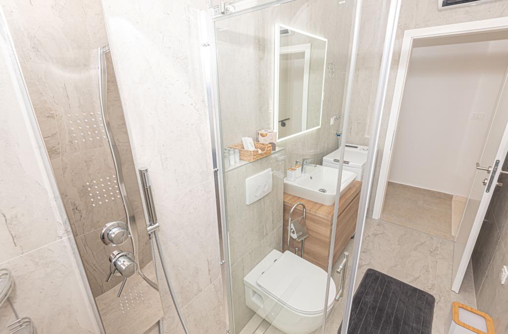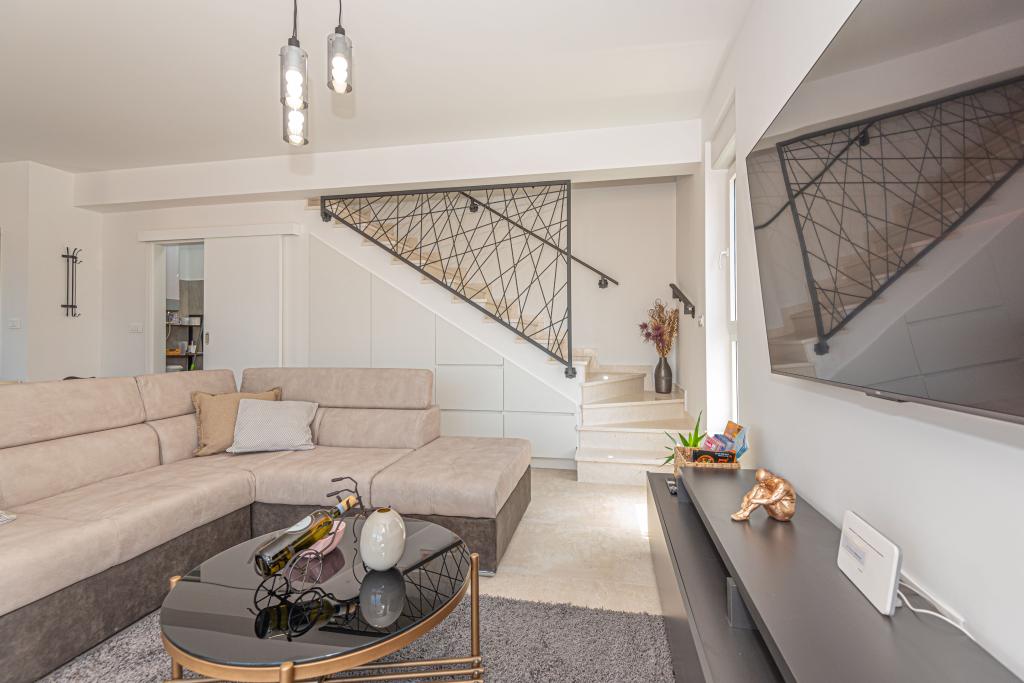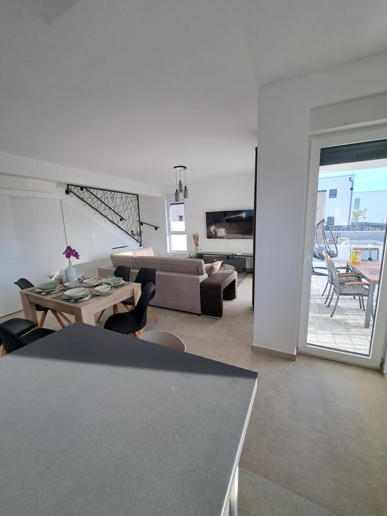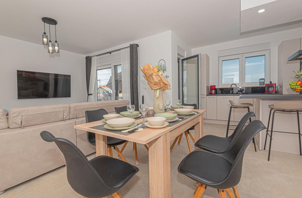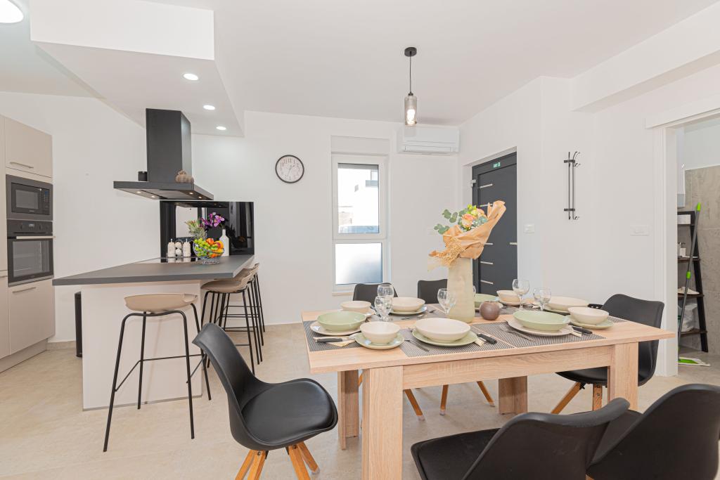 Eine neue, komplett eingerichtete Villa mit Swimmingpool in einer ruhigen Ecke der Stadt Vodice, etwa 1 km oder 15 Gehminuten vom Zentrum, dem Strand und anderen Einrichtungen entfernt. Die Villa verfügt über einen beheizten Pool von 7x3 m, 1,5 m tief, neben dem Pool gibt es Liegestühle, eine Gartenschaukel und Möbel zum Ausruhen im Pavillon. Im Hinterhof gibt es einen Außengrill und einen Esstisch. Das Haus verfügt über drei Zimmer im ersten Stock, ein Hauptschlafzimmer mit Bad und zwei Zimmer mit Bad im gemeinsamen Flur. Die Betten in zwei Zimmern haben die Maße 180x200 cm und im dritten Zimmer gibt es getrennte Betten in den Maßen 90x200 und 120x200. Alle Zimmer sind mit TV und Klimaanlage ausgestattet. Bettwäsche und Handtücher stehen den Gästen zur Verfügung. Im Erdgeschoss ist die Küche komplett ausgestattet mit Geschirr, einem Toaster, einem Stabmixer und einer elektrischen Saftpresse für Zitrusfrüchte, sowie einer Filterkaffeemaschine. Die Küche verfügt über einen Geschirrspüler, einen Kühl- und Gefrierschrank, einen Backofen und eine Mikrowelle. Das Wohnzimmer verfügt über ein Ecksofa und einen Fernseher mit Internet- und Satellitenkanälen.